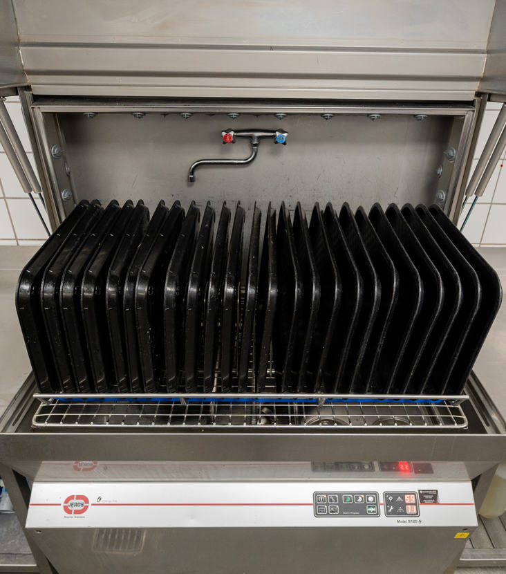 In JEROS's hooded dishwashers, McDonald's employees clean everything from kitchen utensils and cutting boards to various holders, french fry dispensing funnels, and baskets for the fryer, as well as the trays on which the food is served in the restaurants.