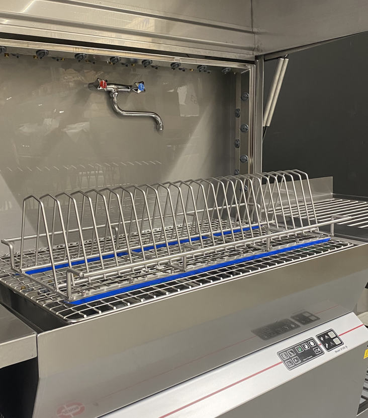 At JEROS, we call this constellation a "pass-through machine," ... A constellation that makes it possible to pre-rinse on one side of the machine, push trays and other items into the machine, and pull all the cleaned dishes out on the other side WITHOUT lifting the dishes.