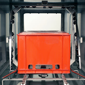 Model 300 er en kraftfuld industrimodel til intensiv brug. Denne kassevasker er bygget med forstærkede komponenter og har en bred vaskekanal med 44 højtydende dyser – heraf 16 bevægelige. Maskinen er designet til grundig rengøring under højt tryk (4 - 4,5 bar) og leverer styrke og tempo, hvor det tæller.
